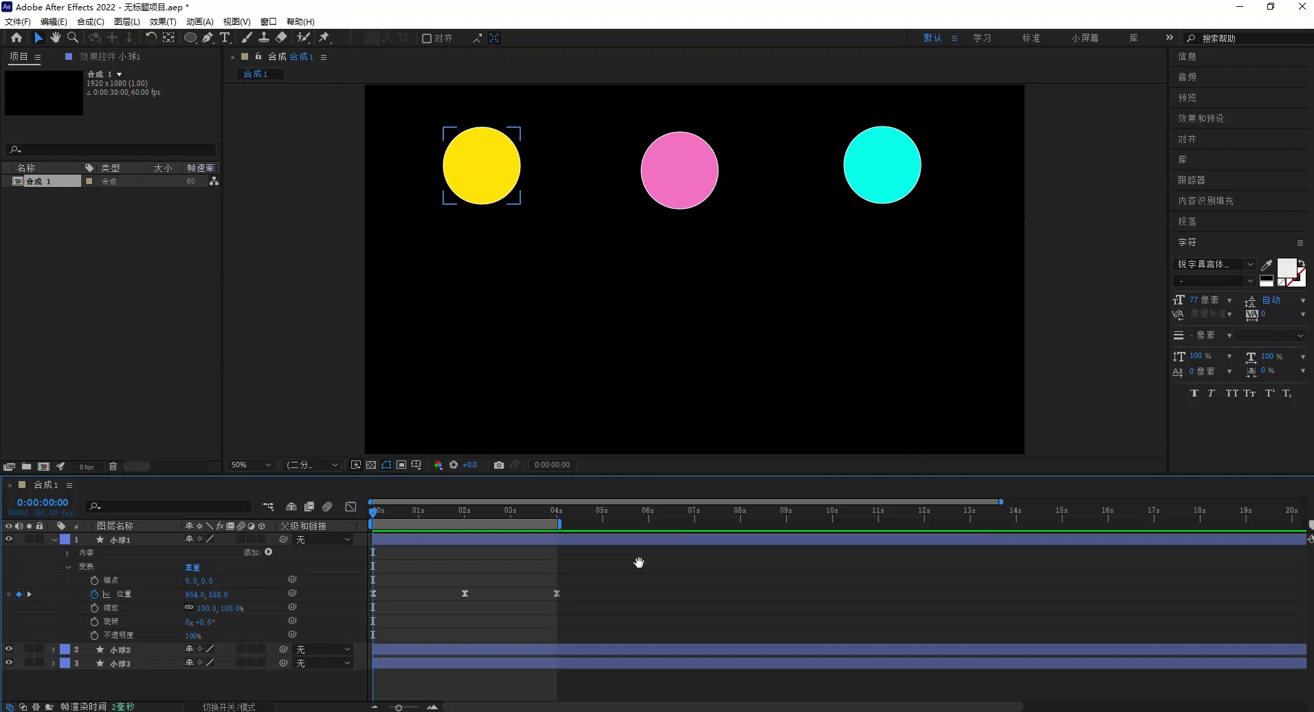 首先,绘制一个小球,并通过Ctrl/Command+C、Ctrl/Command+D复制出额外两个小球,并将所有小球添加上从上向下运动的属性,让小球产生运动;