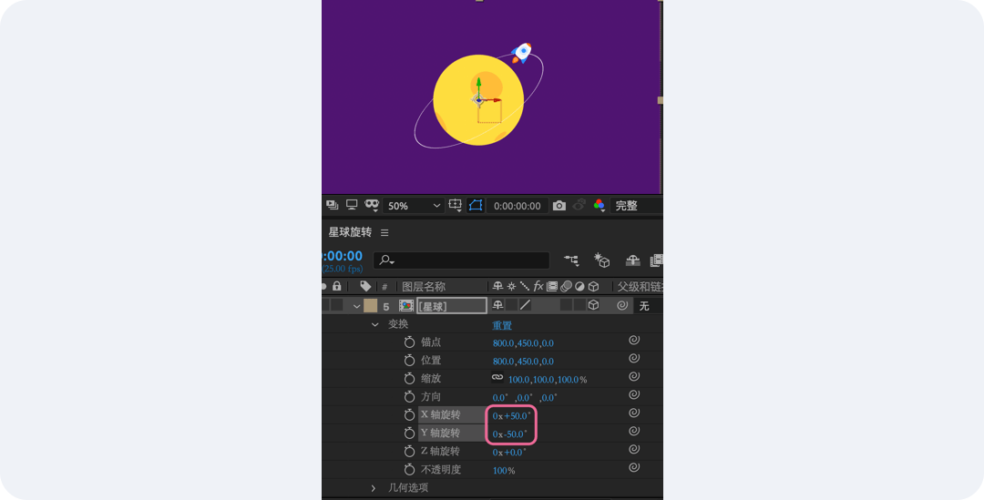 12.也把[星球]“X轴旋转”改为50,“Y轴旋转”为-50,和[空]图层一样的数值;