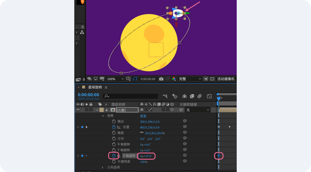 13.时间线放在起始位置 → 把[火箭]图层“Z轴旋转”打上关键帧,并改变数值,使火箭头和运动的轨迹路径一致